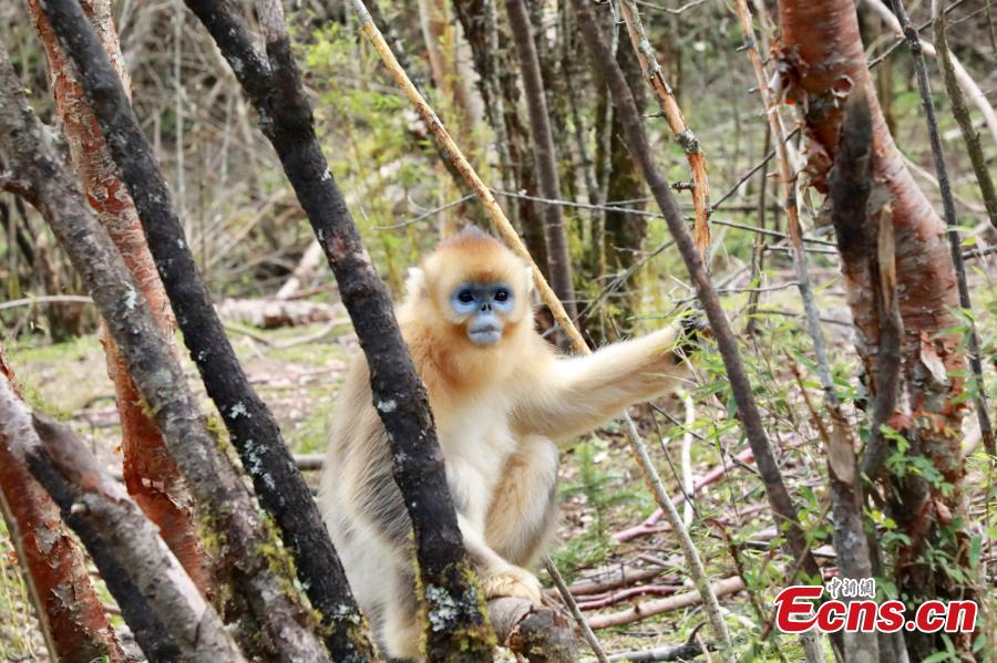Photo shows the golden snub-nosed monkeys in Shennongjia Forestry District in Hubei Province. (Photo: China News Service/Deng Kai)