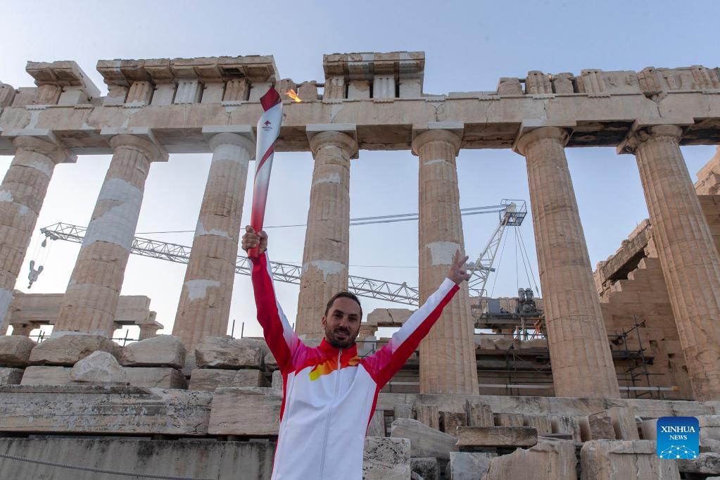 Ioannis Melissanidis, Greek Olympic champion in gymnastics, holds the torch at Acropolis with the Flame for the Beijing 2022 Winter Olympic Games, in Athens, Greece, on Oct. 19, 2021. The Flame for the Beijing 2022 Winter Olympic Games was burning overnight at the Hill of Acropolis and on Tuesday morning it was transferred to the Panathenaic Stadium to be handed over to the organizers of the Beijing 2022 Winter Olympic Games. (Xinhua/Marios Lolos)