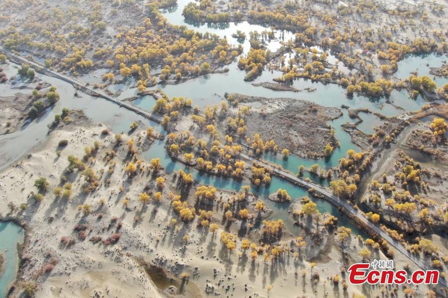 A populus diversifolia forest is seen along a 50-km-long section of Tarim River crossing the north of Taklimakan desert in China's Xinjiang Uygur Autonomous Region.(China News Service/Jiao Yinhui)