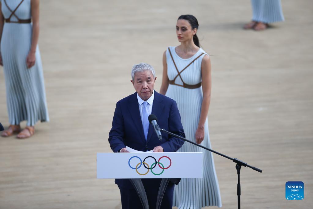 Special representative and Vice-President of Beijing 2022 Yu Zaiqing delivers a speech during the handover ceremony of the Olympic Flame for the Beijing 2022 Winter Olympic Games at the Panathenaic Stadium in Athens, Greece, Oct. 19, 2021. (Xinhua/Zheng Huansong)