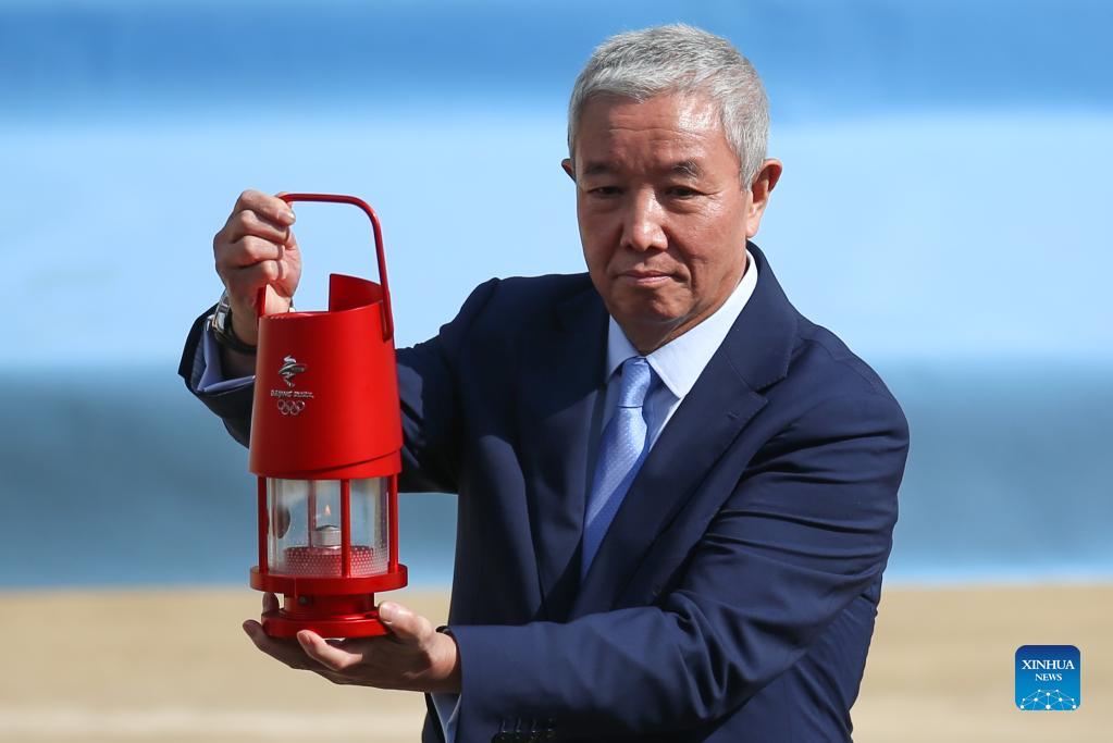 Special representative and Vice-President of Beijing 2022 Yu Zaiqing holds up a lantern containing the Olympic Fame during the handover ceremony of the Olympic Flame for the Beijing 2022 Winter Olympic Games at the Panathenaic Stadium in Athens, Greece, Oct. 19, 2021. (Xinhua/Zheng Huansong)