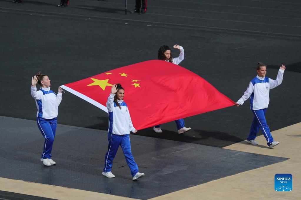 The Chinese national flag is seen during the handover ceremony of the Olympic Flame for the Beijing 2022 Winter Olympic Games at the Panathenaic Stadium in Athens, Greece, Oct. 19, 2021. (Xinhua/Zheng Huansong)