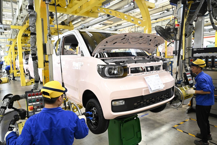 Staff members work on the production line of new energy vehicle at an automobile company in Liuzhou, south China's Guangxi Zhuang Autonomous Region, Aug. 12, 2021. (Photo by Li Hanchi/Xinhua)