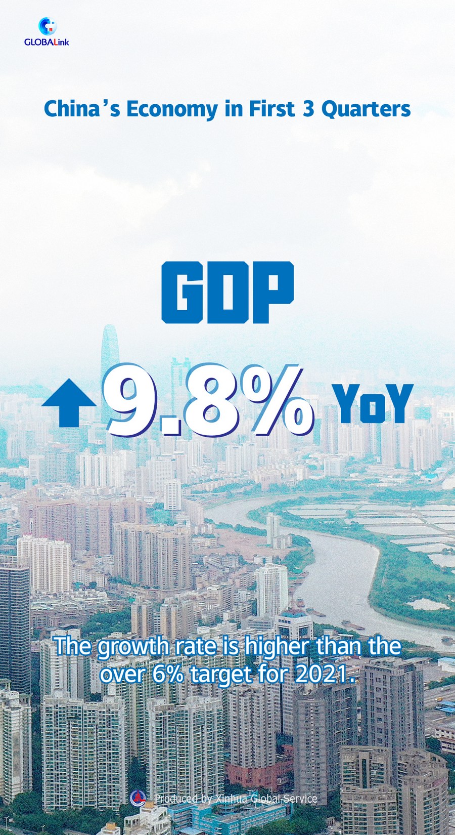 China's GDP grew 4.9 percent year on year in Q3, slower than the growth of 18.3 percent in Q1 and 7.9 percent in Q2. In the first three quarters, the country logged a 9.8 percent GDP expansion, well above its annual growth target of "over 6 percent," data from the National Bureau of Statistics (NBS) shows.