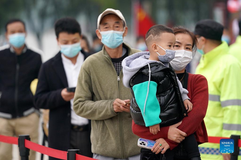 Citizens wait to receive nucleic acid testing at a testing site in Xi'an, northwest China's Shaanxi Province, Oct. 19, 2021. Shaanxi Province has reported seven locally transmitted COVID-19 confirmed cases and one asymptomatic case as of Monday in the recent COVID-19 resurgence. The authorities have strengthened the prevention and control measures to halt the spread of the coronavirus. (Xinhua/Liu Xiao)