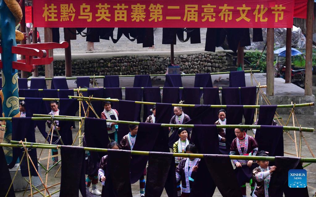 Women of Miao ethnic group display cloth during a "Liang Bu" fair held in Wuying Village, which lies on the border between south China's Guangxi Zhuang Autonomous Region and southwest China's Guizhou Province, on Oct. 19, 2021. "Liang Bu", named for its glistening appearance, is a kind of traditional hand-made cloth of Miao ethnic group. Subject to its complicated producing techniques, "Liang Bu" was once rarely seen. In recent years, it was gradually favored again as the development of local tourism and the improvement in people's awareness of traditional cultural protection. (Xinhua/Huang Xiaobang)