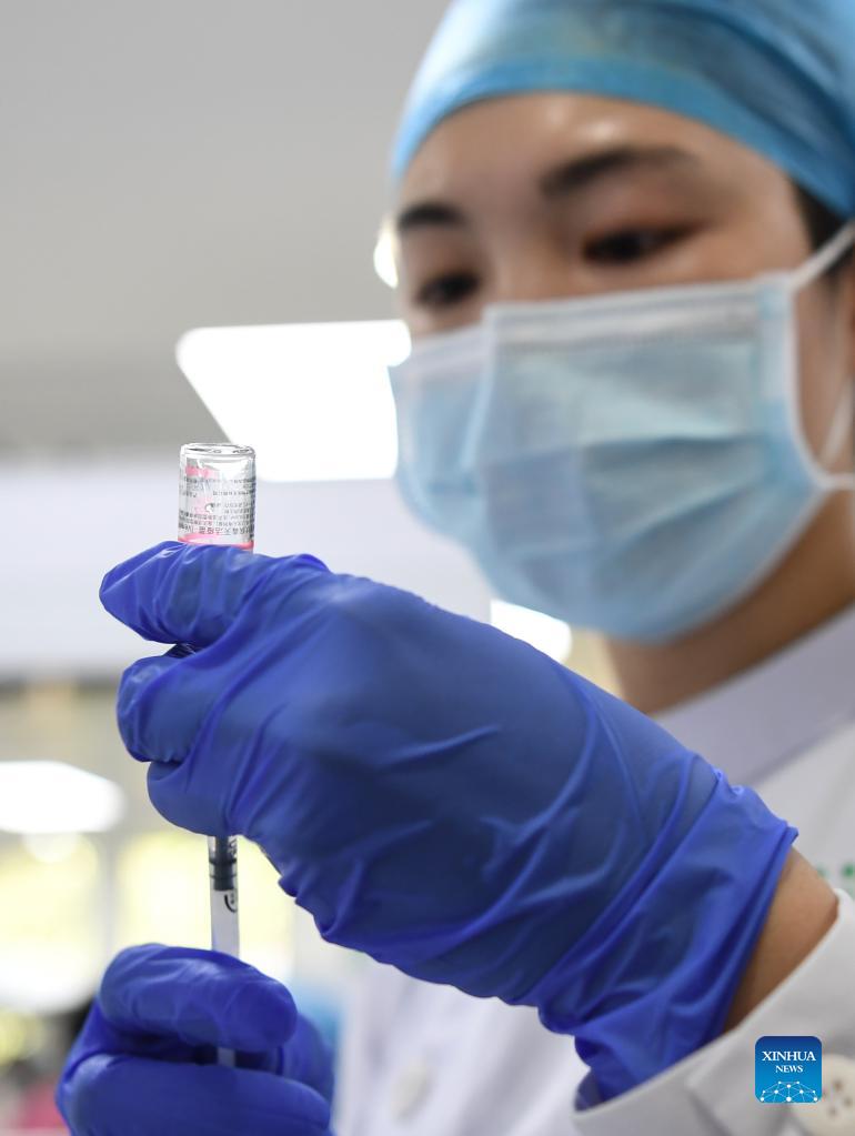 A medical worker prepares a booster shot of COVID-19 vaccine at a vaccination clinic in Fanyu District of Guangzhou City, south China's Guangdong Province, Oct. 18, 2021. Guangzhou has started to give booster shots of COVID-19 vaccine to people aged over 18 who received the second dose of inactivated vaccine or the first dose of adenovirus vector vaccines at least six months ago. (Xinhua/Deng Hua)