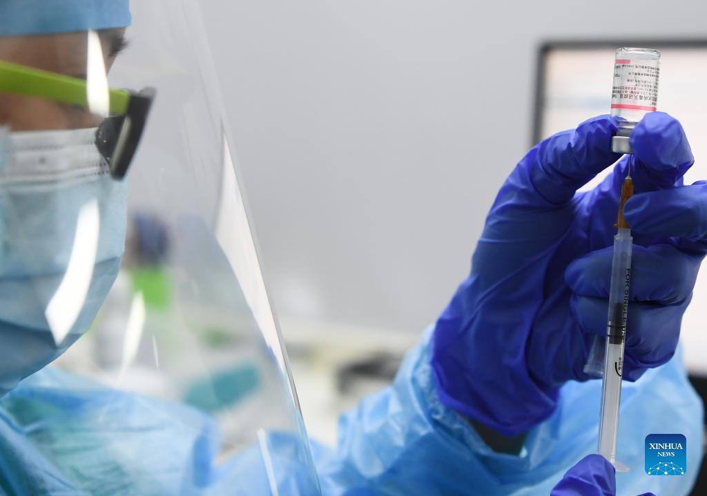 A medical worker prepares a booster shot of COVID-19 vaccine at a vaccination clinic in Fanyu District of Guangzhou City, south China's Guangdong Province, Oct. 18, 2021. Guangzhou has started to give booster shots of COVID-19 vaccine to people aged over 18 who received the second dose of inactivated vaccine or the first dose of adenovirus vector vaccines at least six months ago. (Xinhua/Deng Hua)