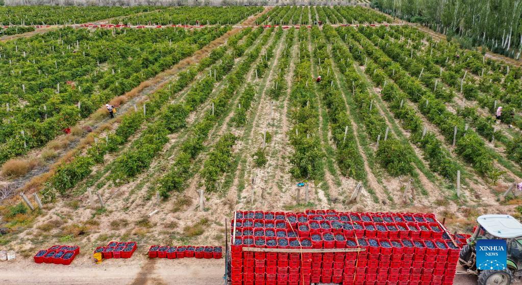 Aerial photo taken on Oct. 14, 2021 shows workers harvesting grapes in a vineyard at the eastern foot of Helan Mountain, northwest China's Ningxia Hui Autonomous Region. Farmers here are busy picking up wine grapes during the harvest season in the vineyards. With abundant sunshine, rich irrigation and an appropriate climate, Ningxia's vast barren Gobi Desert is deemed the "golden zone" for growing wine grapes. (Xinhua/Feng Kaihua)