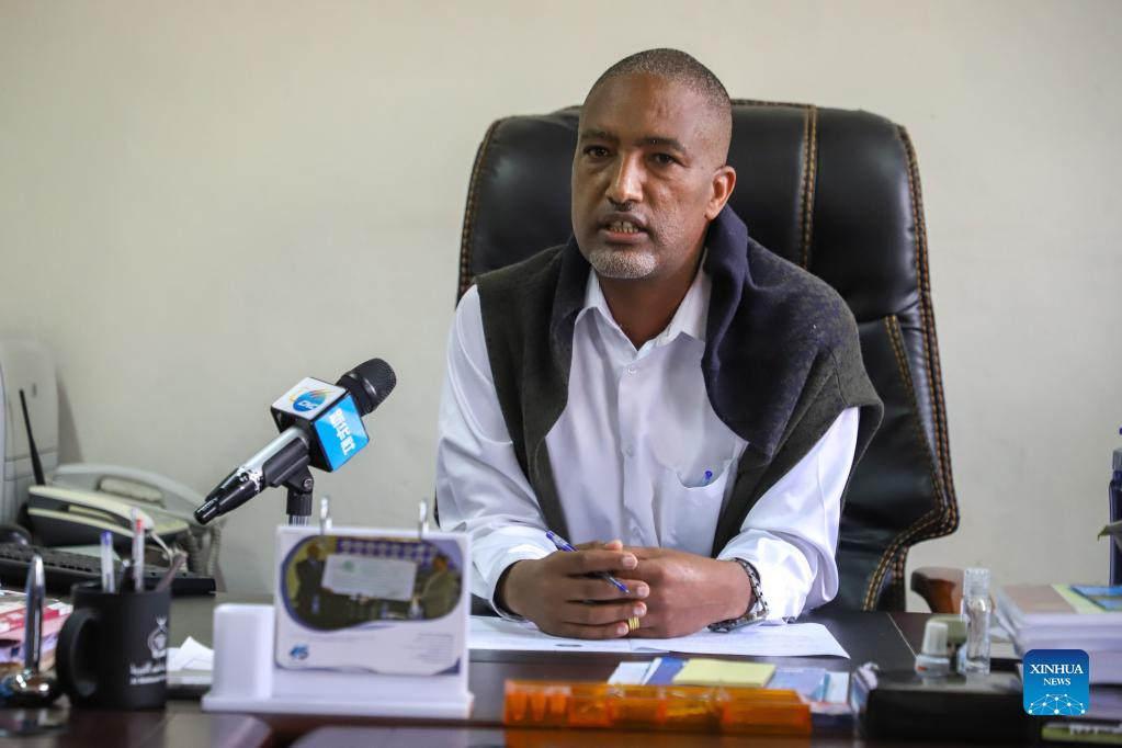 Amenuael Alemayehu, Dean of College of Humanities, Language Studies, Journalism and Communications at Addis Ababa University, speaks during an interview with Xinhua in Addis Ababa, Ethiopia, on Oct. 14, 2021. Ethiopia's Addis Ababa University (AAU) announced that it has finalized preparations to launch its first-ever Master of Arts (MA) program in the Chinese language in Ethiopia. (Xinhua/Michael Tewelde)