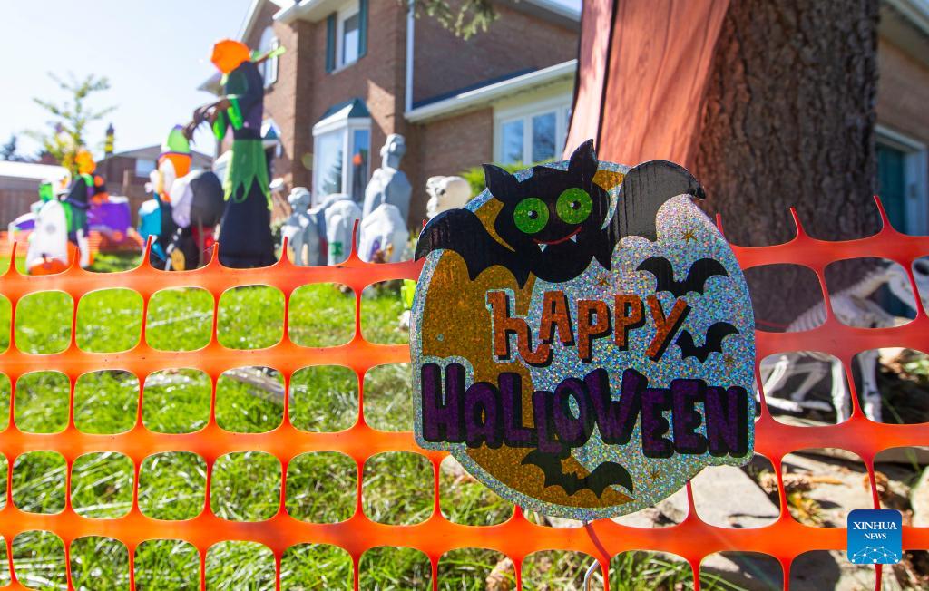 Halloween decorations are seen in front of a house in Mississauga, Ontario, Canada, on Oct. 19, 2021. Some residents in Ontario started to decorate their houses for the upcoming Halloween. (Photo by Zou Zheng/Xinhua)
