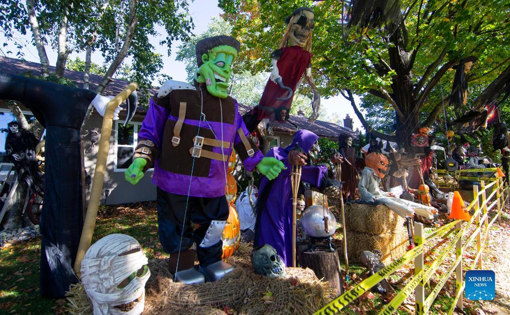 Halloween decorations are seen in front of a house in Oakville, Ontario, Canada, on Oct. 19, 2021. Some residents in Ontario started to decorate their houses for the upcoming Halloween. (Photo by Zou Zheng/Xinhua)