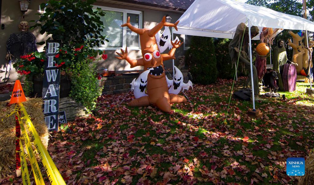 Halloween decorations are seen in front of a house in Oakville, Ontario, Canada, on Oct. 19, 2021. Some residents in Ontario started to decorate their houses for the upcoming Halloween. (Photo by Zou Zheng/Xinhua)