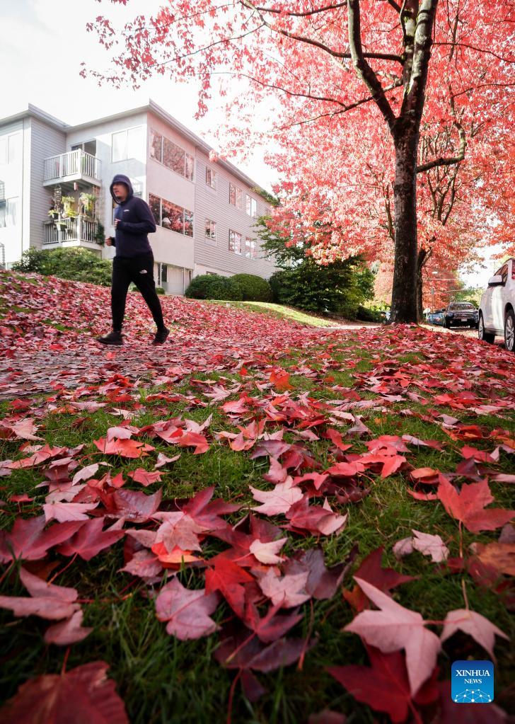 A street is blanketed with the fall foliage in Vancouver, British Columbia, Canada, on Oct. 19, 2021. (Photo by Liang Sen/Xinhua)