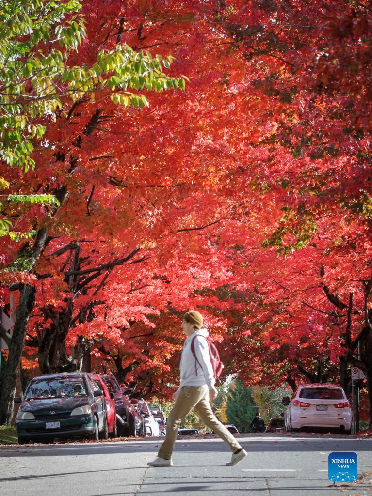 A man walks past a street with the fall foliage in Vancouver, British Columbia, Canada, on Oct. 19, 2021. (Photo by Liang Sen/Xinhua)