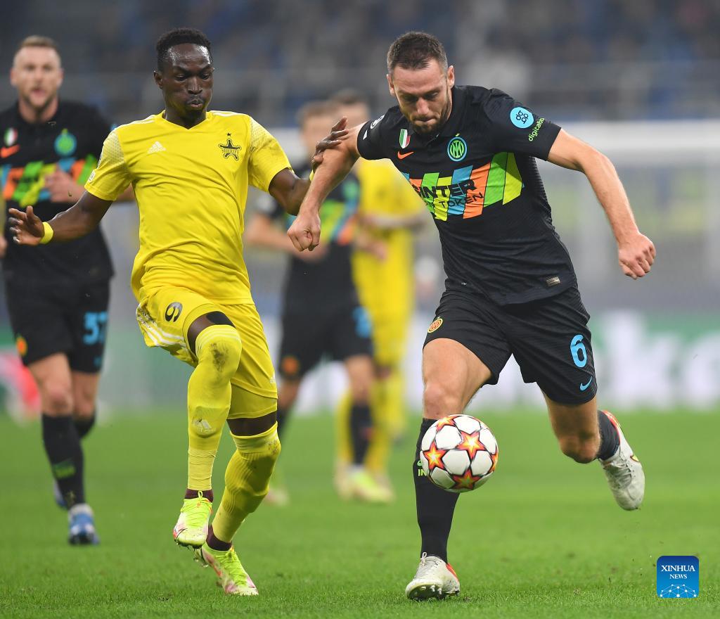FC Inter's Stefan De Vrij (R) vies with FC Sheriff Tiraspol's Adama Traore during the UEFA Champions League Group D match between FC Inter and FC Sheriff Tiraspol in Milan, Italy, Oct. 19, 2021. (Str/Xinhua)