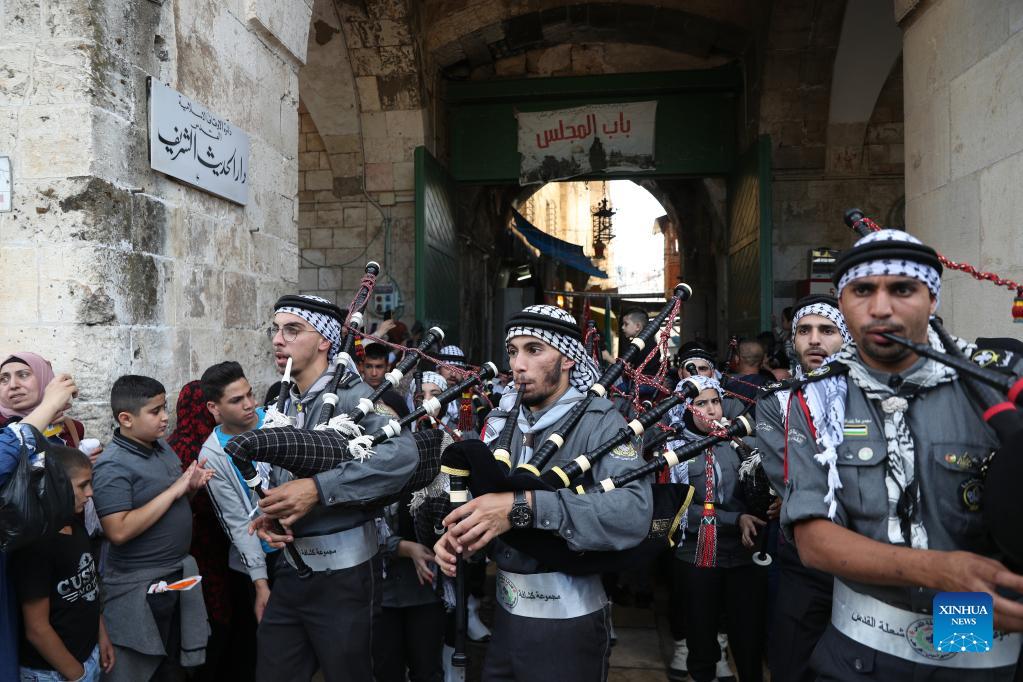 Palestinians participate in a celebration for the Prophet Muhammad's birthday in the Old City of Jerusalem, on Oct. 19, 2021. (Photo by Muammar Awad/Xinhua)