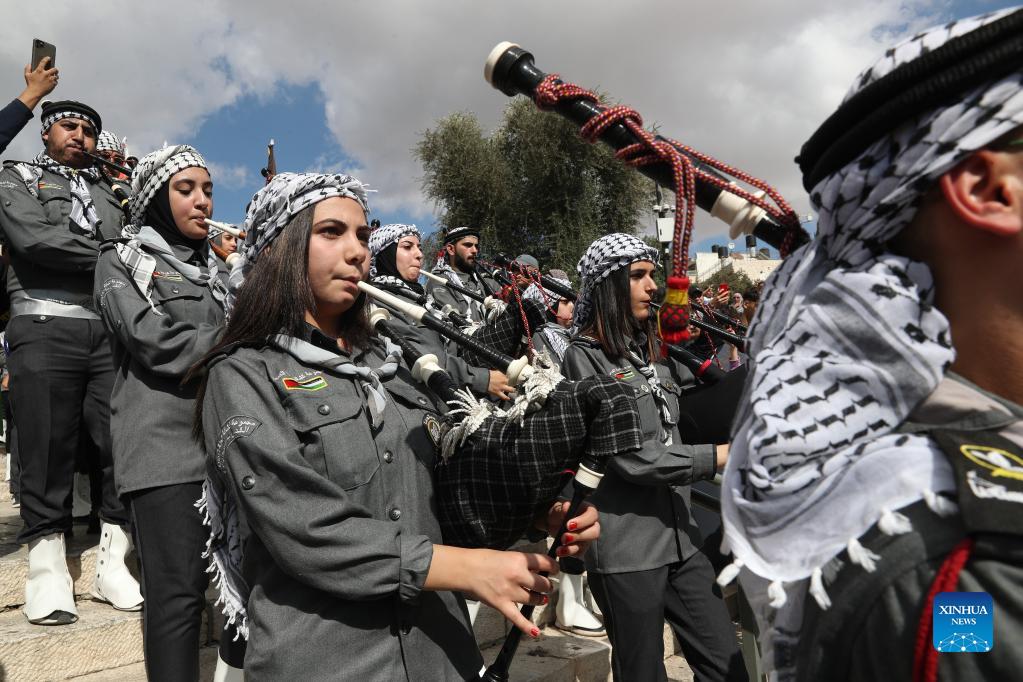 Palestinians participate in a celebration for the Prophet Muhammad's birthday in the Old City of Jerusalem, on Oct. 19, 2021. (Photo by Muammar Awad/Xinhua)