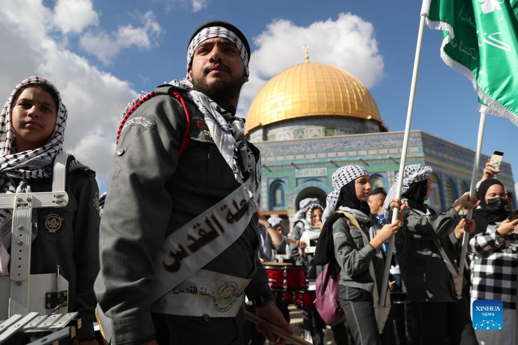 Palestinians participate in a celebration for the Prophet Muhammad's birthday in the Old City of Jerusalem, on Oct. 19, 2021. (Photo by Muammar Awad/Xinhua)