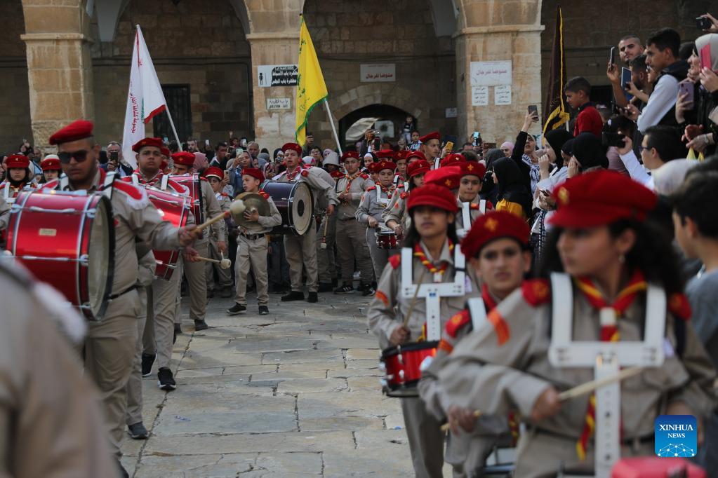 Palestinians participate in a celebration for the Prophet Muhammad's birthday in the Old City of Jerusalem, on Oct. 19, 2021. (Photo by Muammar Awad/Xinhua)