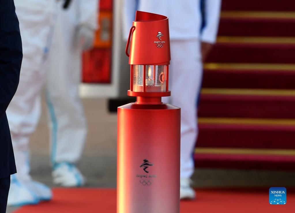 Photo taken on Oct. 20, 2021 shows the flame lantern as the Beijing 2022 Olympic flame arrived at Capital International Airport in Beijing, capital of China, Oct. 20, 2021. The Olympic flame, ignited for the Beijing 2022 Olympic Winter Games in Ancient Olympia in western Greece, arrived in Beijing on Wednesday morning. A welcoming ceremony was held at the Olympic Tower, an iconic landmark from the 2008 Beijing Olympic Games. (Xinhua/Zhang Chenlin)