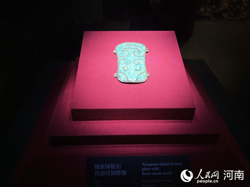Photo shows a turquoise-inlaid bronze plate with an animal mask pattern at the Erlitou Site Museum in Luoyang city, central China’s Henan province. (Photo/Zhang Yang)