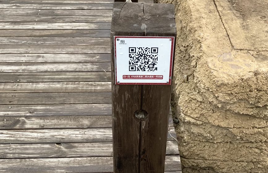 Photo shows a QR code at the No. 1 palace of the Erlitou relic site in Luoyang city, central China’s Henan province. By scanning the code, visitors can enjoy a virtual reality tour of the palace. (Photo/Zhang Yang)