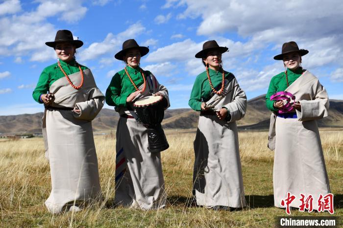 Several artists sing Tibetan songs accompanied by Longtouqin, or dragon-head harp, on Hongyuan Prairie of Aba Tibetan and Qiang Autonomous Prefecture, Sichuan Province, Oct. 19, 2021. (Photo: China News Service/Zhang Lang)