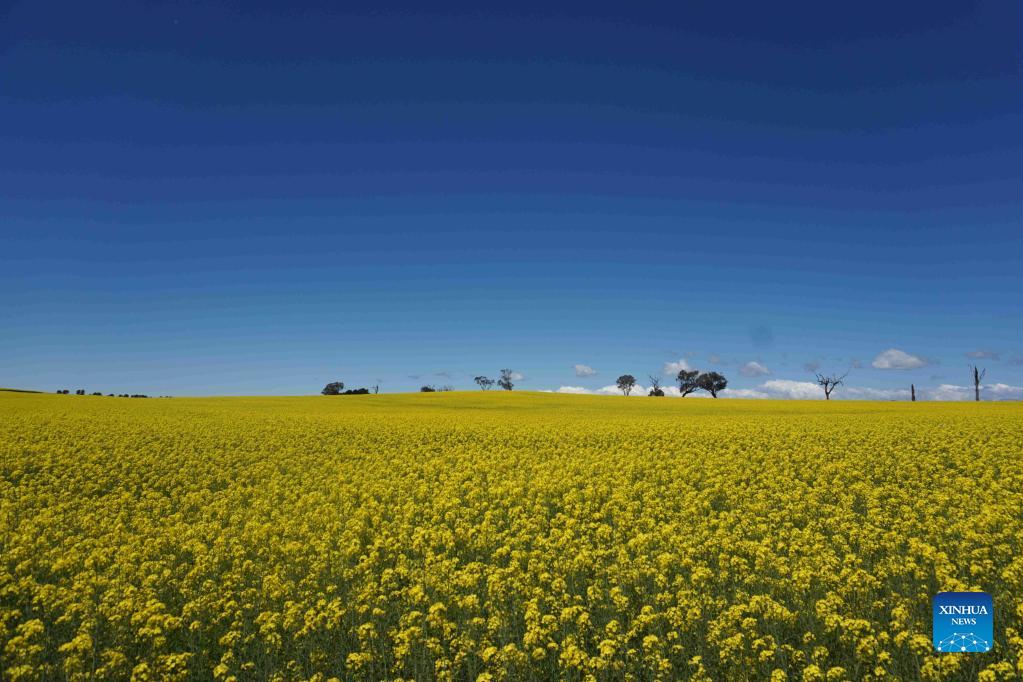 Photo taken on Oct. 19, 2021 shows a view of a canola field outside Canberra, capital of Australia. (Photo by Jiang Chenyi/Xinhua)