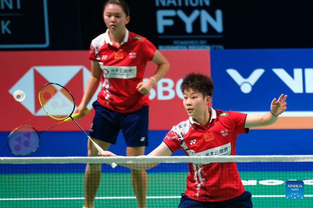 Liu Xuanxuan (R)/Xia Yuting compete during the women's doubles first round match between Liu Xuanxuan/Xia Yuting of China and Rachel Honderich/Kristen Tsai of Canada at the Victor Denmark Open 2021 in Odense, Denmark, Oct. 20, 2021. (Xinhua/Zhang Cheng)