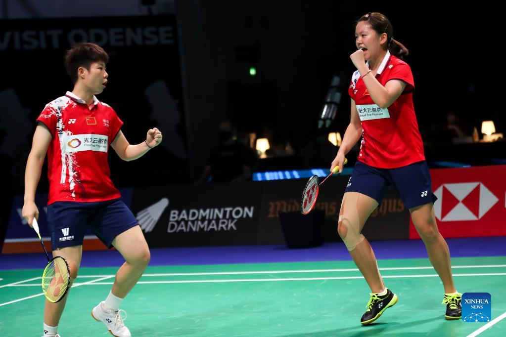 Liu Xuanxuan (L)/Xia Yuting react during the women's doubles first round match between Liu Xuanxuan/Xia Yuting of China and Rachel Honderich/Kristen Tsai of Canada at the Victor Denmark Open 2021 in Odense, Denmark, Oct. 20, 2021. (Xinhua/Zhang Cheng)