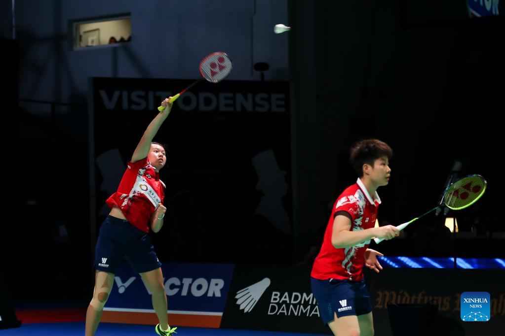 Liu Xuanxuan/Xia Yuting (L) compete during the women's doubles first round match between Liu Xuanxuan/Xia Yuting of China and Rachel Honderich/Kristen Tsai of Canada at the Victor Denmark Open 2021 in Odense, Denmark, Oct. 20, 2021. (Xinhua/Zhang Cheng)