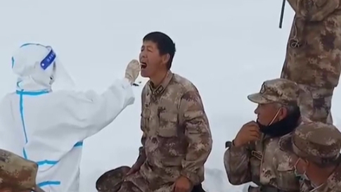 A medical worker tested border guards for COVID-19 during heavy snow in Northwest China's Xinjiang Uygur Autonomous Region.
