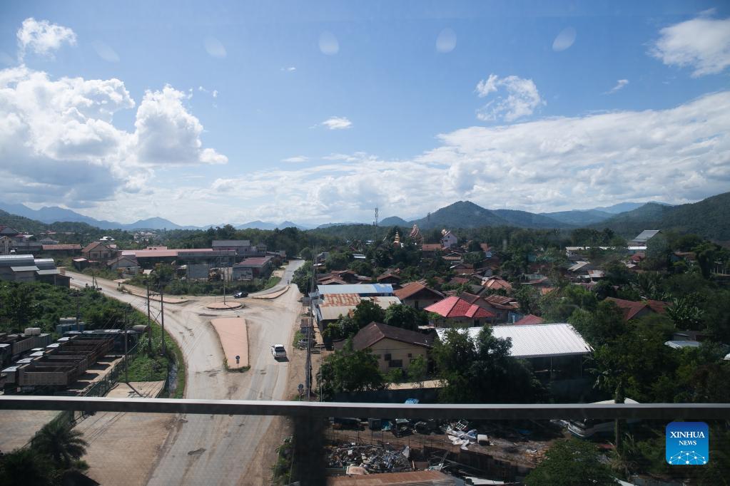 Photo taken on Oct. 20, 2021 from the first dynamic testing train travelling from Lao capital Vientiane to Laos-China border town of Boten shows the view of Luang Prabang's outskirts in northern Laos. The first dynamic testing train departed from the Vientiane Station of China-Laos Railway on Wednesday morning and headed north to the Laos-China border town of Boten to kick off the dynamic testing along the China-Laos Railway. (Photo by Kaikeo Saiyasane/Xinhua)