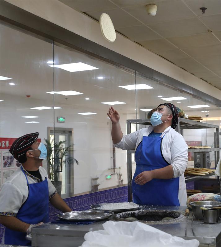 Workers make naan bread at a workshop in Yining city, Ili Kazak autonomous prefecture in Xinjiang, on Sept 28, 2021. (Photo: chinadaily.com.cn/Zou Hong)