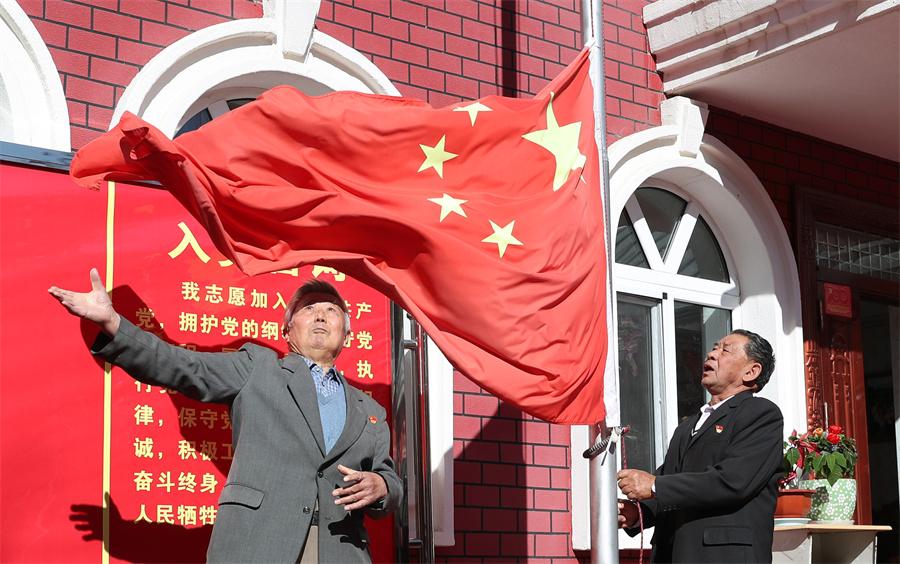 Sadikjan Emin (right), a 75-year-old resident of Tacheng city, Northwest China's Xinjiang Uygur autonomous region, raises the national flag at his home on Sept 24, 2021. The ritual of raising national flag, which started 12 years old, has attracted many visitors. (Photo:chinadaily.com.cn/by Zou Hong)