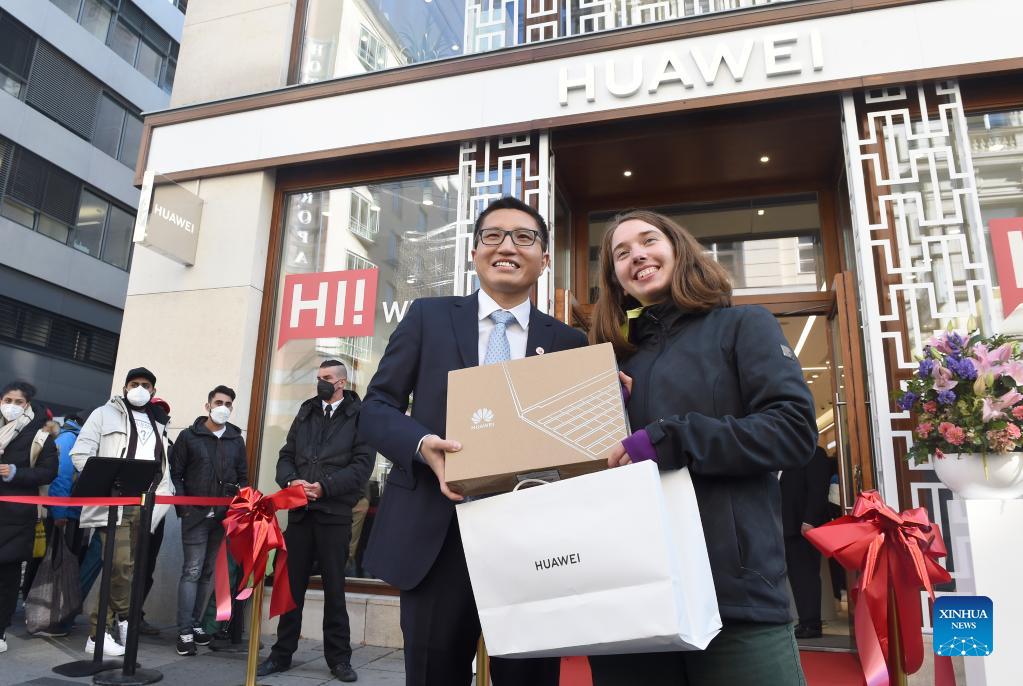 A staff member (L) poses for photos with the first customer of the newly opened Huawei flagship store in Vienna, Austria, Oct. 20, 2021. The Huawei flagship store officially opened Wednesday in the city center of Vienna. (Xinhua/Guo Chen)