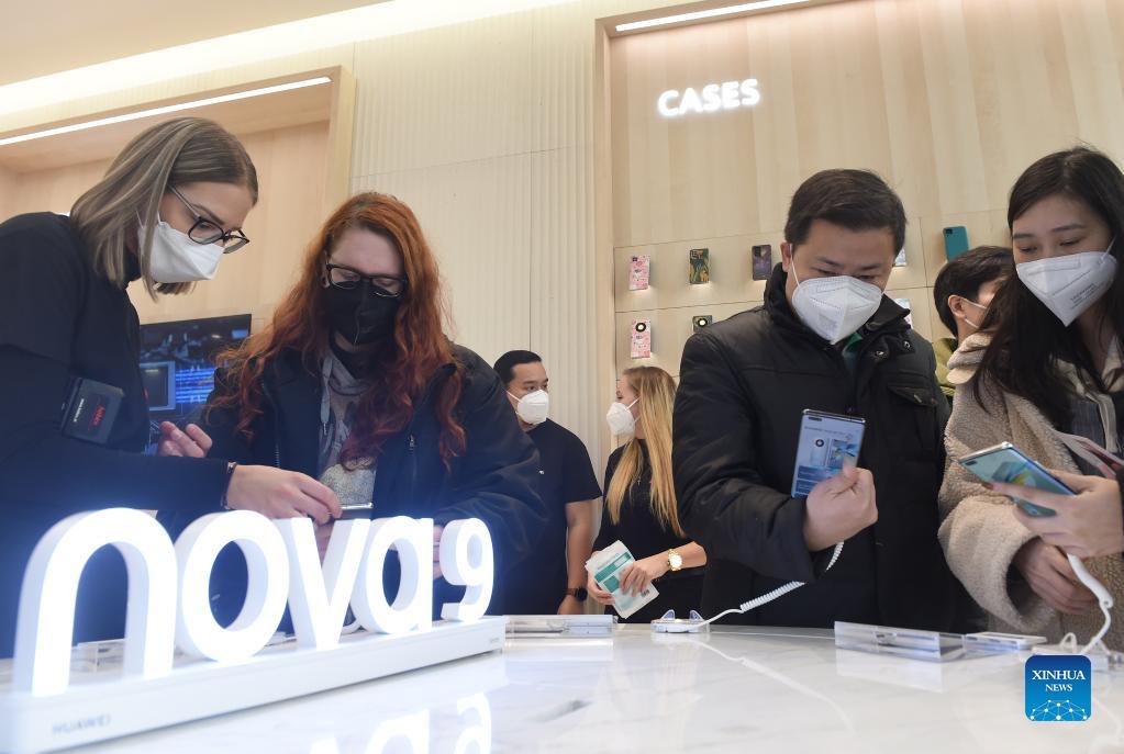 Customers shop at the newly opened Huawei flagship store in Vienna, Austria, Oct. 20, 2021. The Huawei flagship store officially opened Wednesday in the city center of Vienna. (Xinhua/Guo Chen)