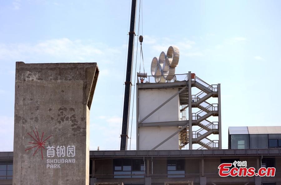 Workers install the Olympic rings at Shougang Park in Beijing, Oct. 20, 2021. (Photo: China News Service/Bian Zhengfeng)