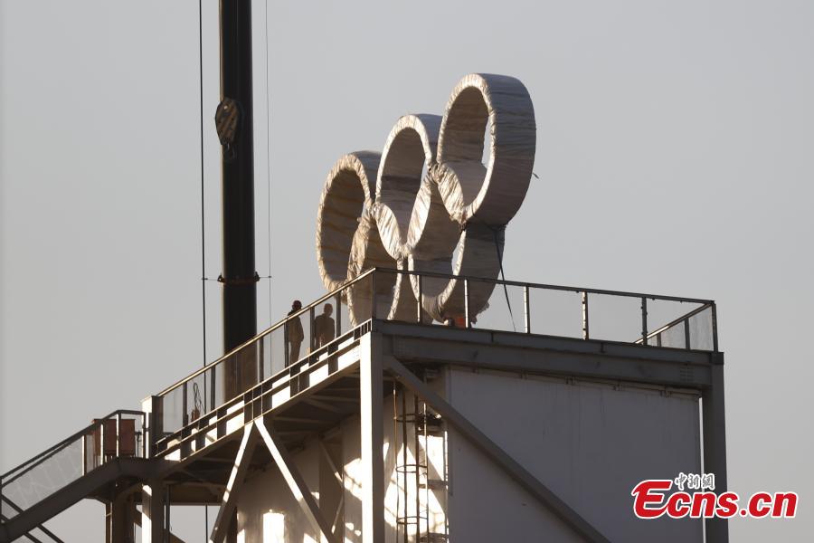 Workers install the Olympic rings at Shougang Park in Beijing, Oct. 20, 2021. (Photo: China News Service/Sheng Jiapeng)