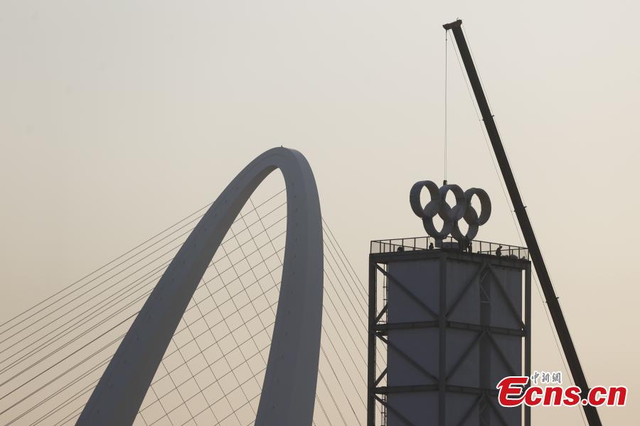 Workers install the Olympic rings at Shougang Park in Beijing, Oct. 20, 2021, Beijing. (Photo: China News Service/Sheng Jiapeng)