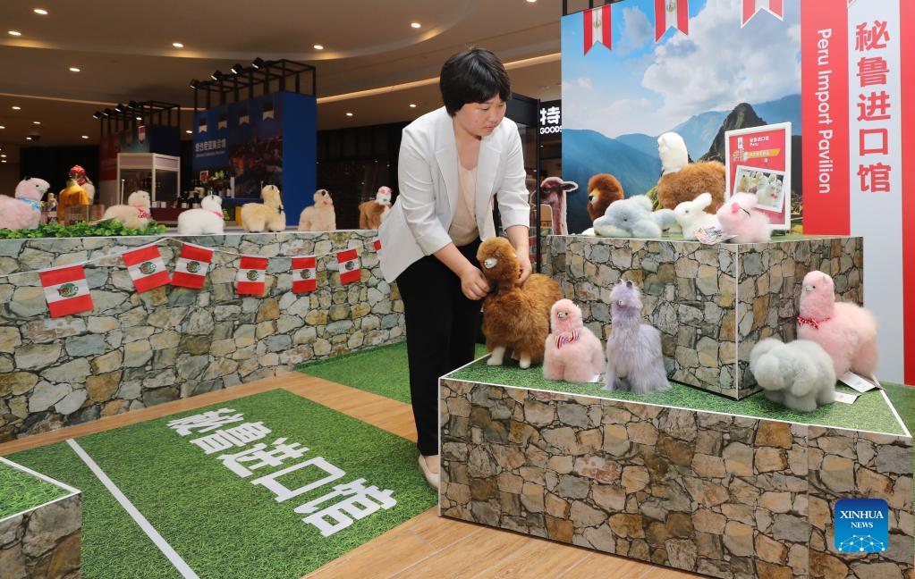 Ma Yuxia organizes alpaca-fur stuffed toys at the Peru Import Pavillon of the Greenland Global Commodity Trading Hub in Shanghai, east China, Oct. 15, 2021. At the first China International Import Expo (CIIE), Ma Yuxia, a Chinese businesswoman based in South America, introduced the plush toy alpacas made by Uncle Mamani, a Peruvian craftsman, into the Chinese market. Ma and her Peruvian partners rented a booth of merely 9 square meters at the first CIIE to display and promote these toys and other traditional hand-made artcrafts in Peru. They also established their own brand, known as Warmpaca (meaning "warm alpaca"). The business was unexpectedly successful. After participating in the CIIE for three consecutive years, Ma and her partners gained access to the Chinese market with these cute little "alpacas". At the 4th CIIE, Ma's booth is to expand fourfold. On the other side of the Pacific, Uncle Mamani's family has built a new house, bought a car, and involved nearly 200 people from his village in his business. (Xinhua/Fang Zhe)