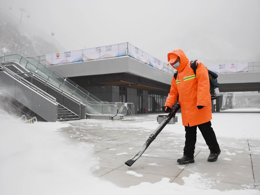 A staff member sweeps snow during a testing program for the 2022 Olympic and Paralympic Winter Games to root out problems and accumulate data at the National Alpine Skiing Center in Yanqing District, Beijing, capital of China, Feb. 23, 2021. (Xinhua/Zhang Chenlin)