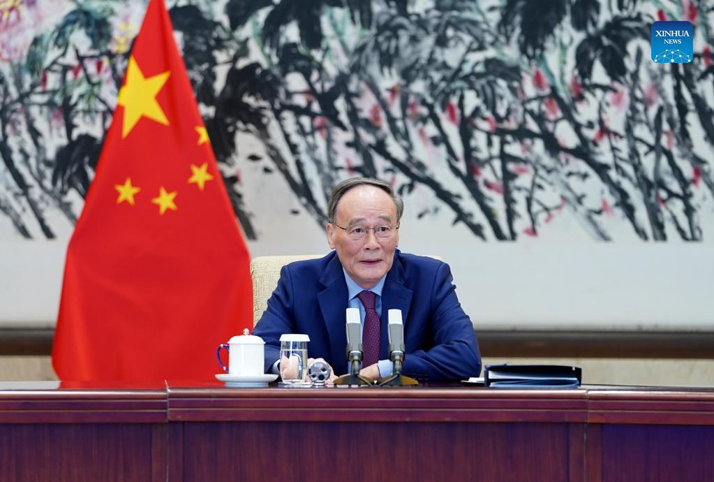 BEIJING, Oct. 20 (Xinhua) -- Chinese Vice President Wang Qishan met with members of the advisory board of the elite Tsinghua University School of Economics and Management in Beijing via video link Wednesday, calling on them to make greater contribution to promoting exchanges between China and other countries and enhancing common interest.