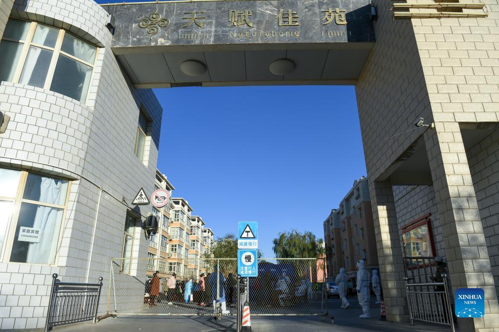 Photo taken on Oct. 20, 2021 shows a residential area under temporary lockdown due to COVID-19 control and prevention measures in Ejina Banner of Alxa League, north China's Inner Mongolia Autonomous Region. As of 7 a.m. Wednesday, Inner Mongolia had 12 locally transmitted confirmed COVID-19 cases under medical treatment, the regional health commission said. (Xinhua/Bei He)