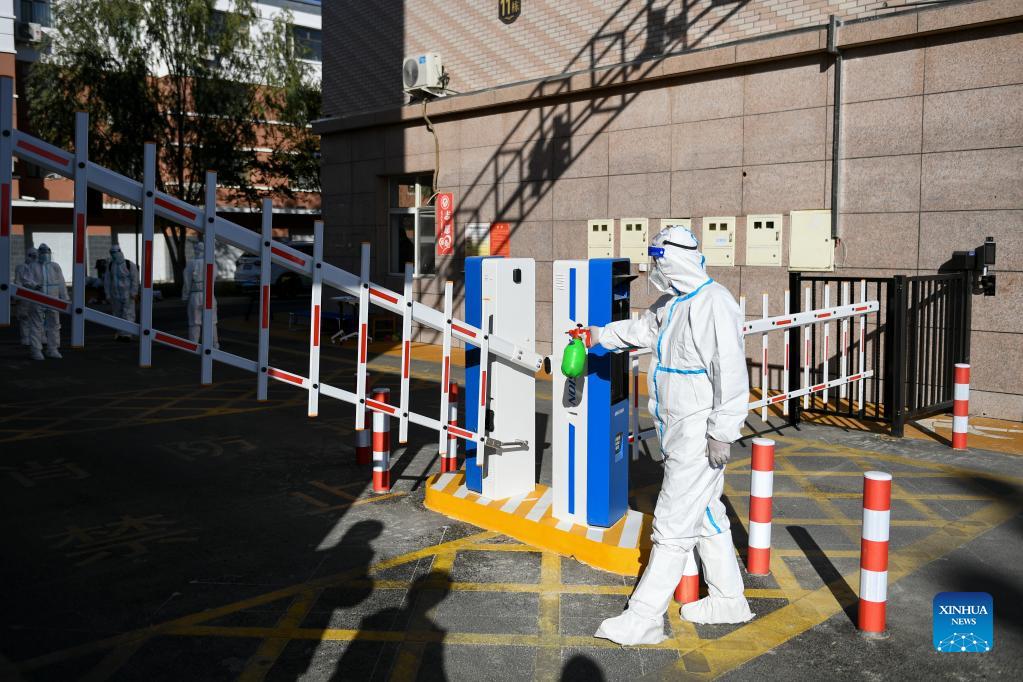 A medical worker disinfects facilities at a residential area in Ejina Banner of Alxa League, north China's Inner Mongolia Autonomous Region, Oct. 20, 2021. As of 7 a.m. Wednesday, Inner Mongolia had 12 locally transmitted confirmed COVID-19 cases under medical treatment, the regional health commission said. (Xinhua/Bei He)