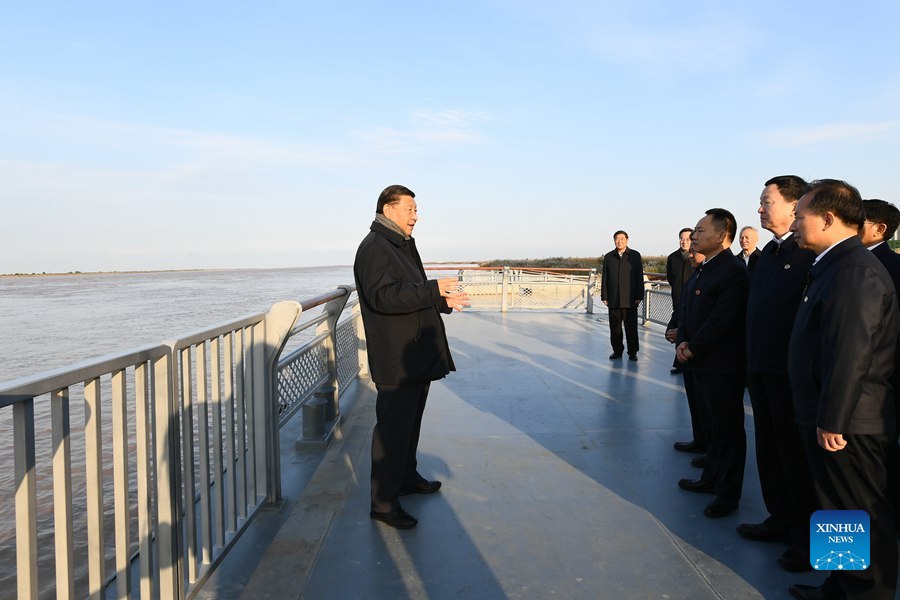 Chinese President Xi Jinping, also general secretary of the Communist Party of China Central Committee and chairman of the Central Military Commission, checks the Yellow River's waterways and learns about the ecological protection and high-quality development of the Yellow River basin at a dock as he inspects the estuary of the Yellow River in the city of Dongying, east China's Shandong Province, Oct. 20, 2021. (Xinhua/Xie Huanchi)