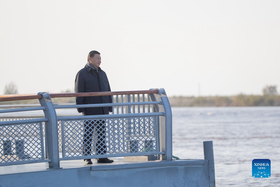 Chinese President Xi Jinping, also general secretary of the Communist Party of China Central Committee and chairman of the Central Military Commission, checks the Yellow River's waterways and learns about the ecological protection and high-quality development of the Yellow River basin at a dock as he inspects the estuary of the Yellow River in the city of Dongying, east China's Shandong Province, Oct. 20, 2021. (Xinhua/Wang Ye)