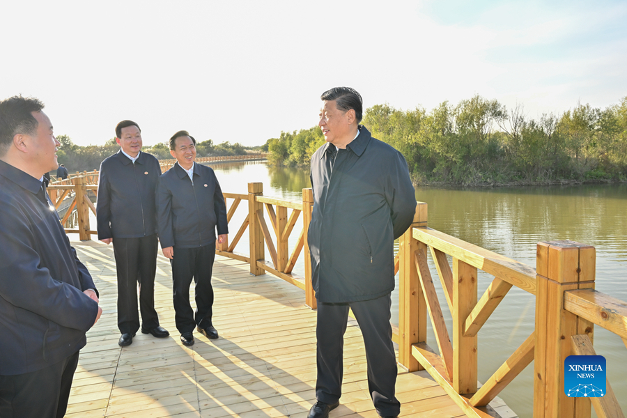 Chinese President Xi Jinping, also general secretary of the Communist Party of China Central Committee and chairman of the Central Military Commission, checks the ecological environment of the wetlands in the Yellow River Delta and learns about the ecological protection and high-quality development of the Yellow River basin at a national-level nature reserve of the river delta as he inspects the estuary of the Yellow River in the city of Dongying, east China's Shandong Province, Oct. 20, 2021. (Xinhua/Li Xueren)