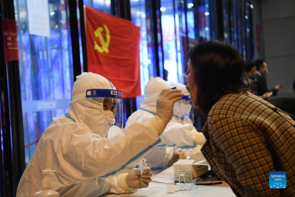 A medical worker collects swab samples at a nucleic acid testing site in Chengguan District of Lanzhou City, northwest China's Gansu Province, Oct. 21, 2021. As of 8 p.m. Wednesday, Lanzhou has registered a total of eight locally transmitted confirmed COVID-19 cases and one asymptomatic case since new local infections were reported. Local authorities set up hundreds of nucleic acid testing sites to provide 24-hour testing services for the residents. (Xinhua/Fan Peishen)